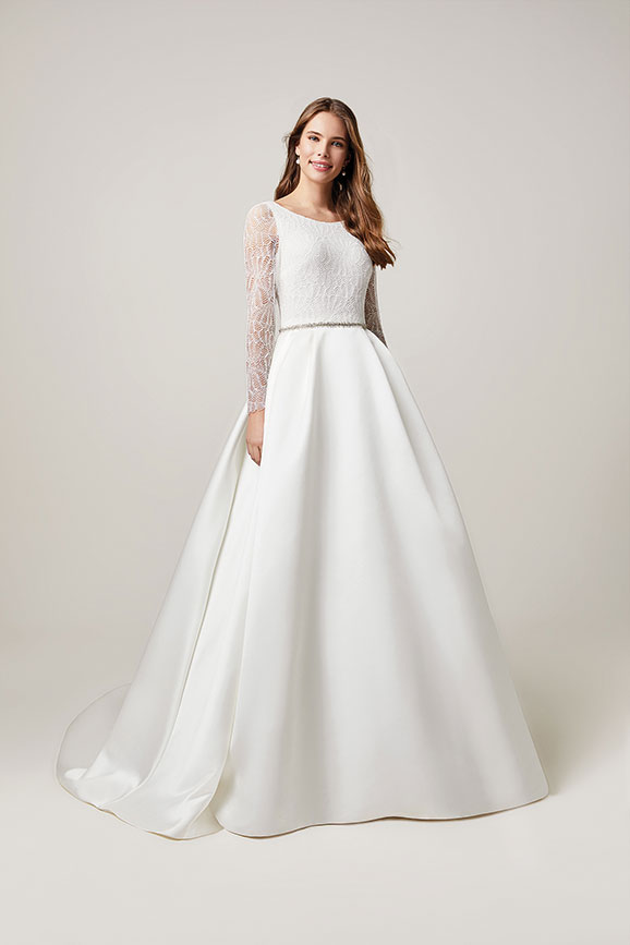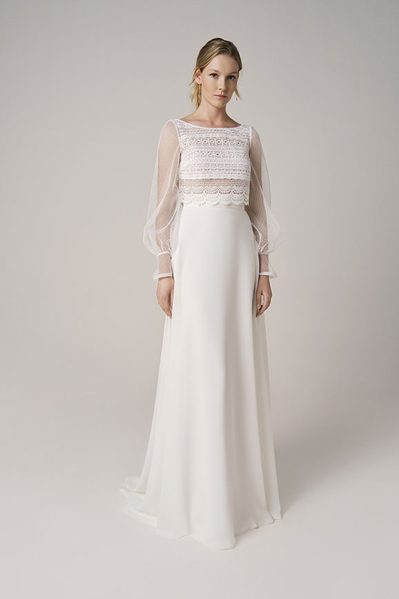 Vestido muito elegante com corte a direito em crepe que marca ligeiramente a silhueta. Decote em barco à frente e decote pronunciado nas costas. A manga comprida termina com aplicação tipo folhas no mesmo tecido.sdsadasdsadadas