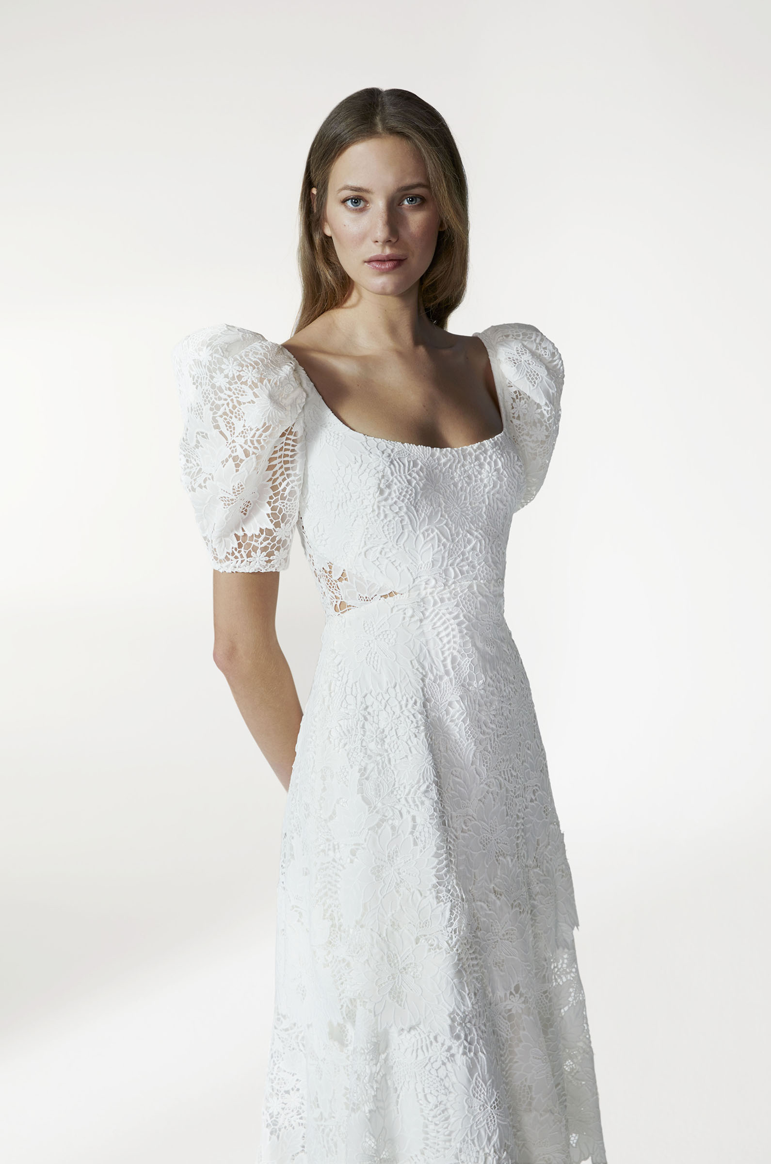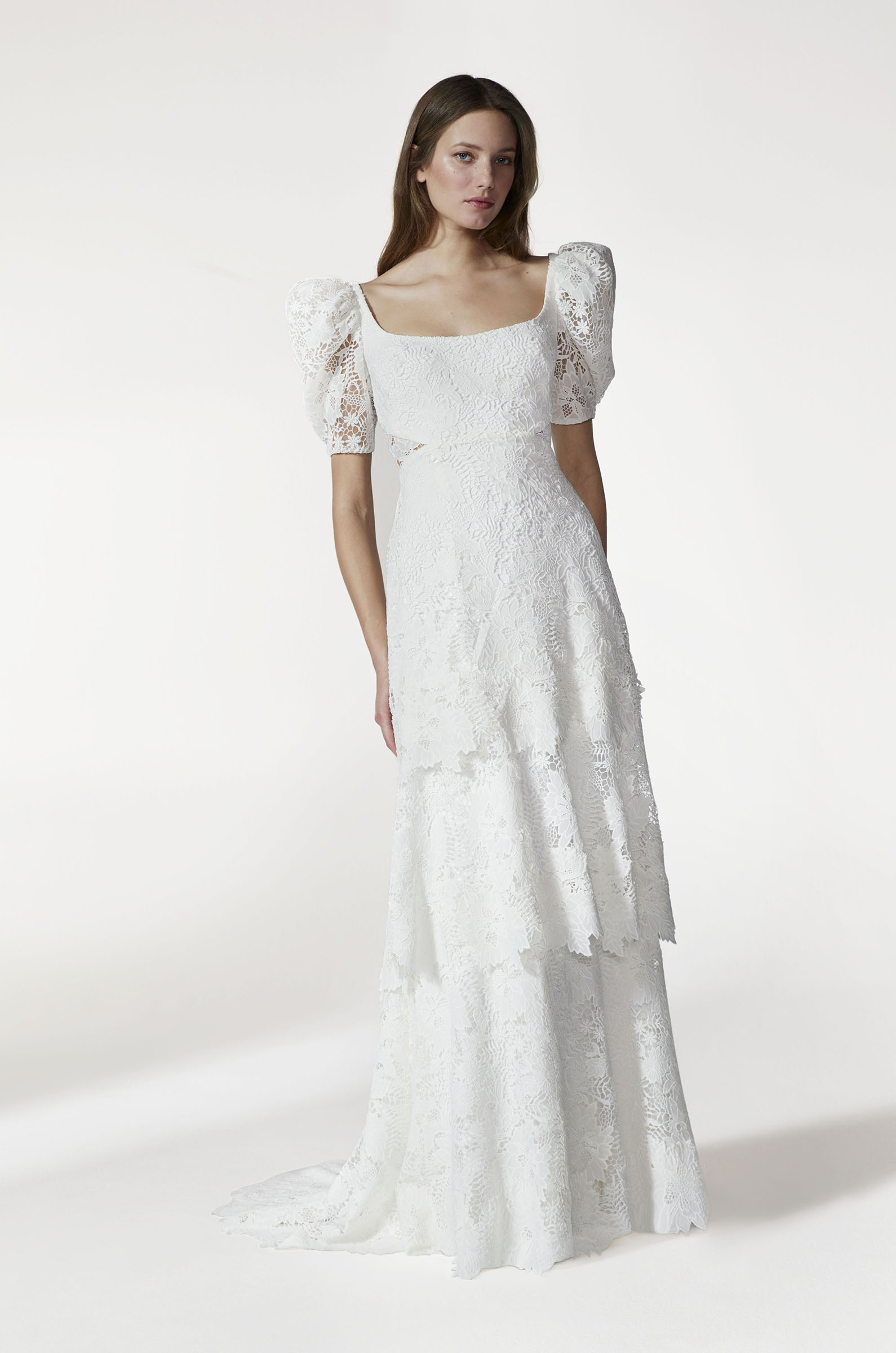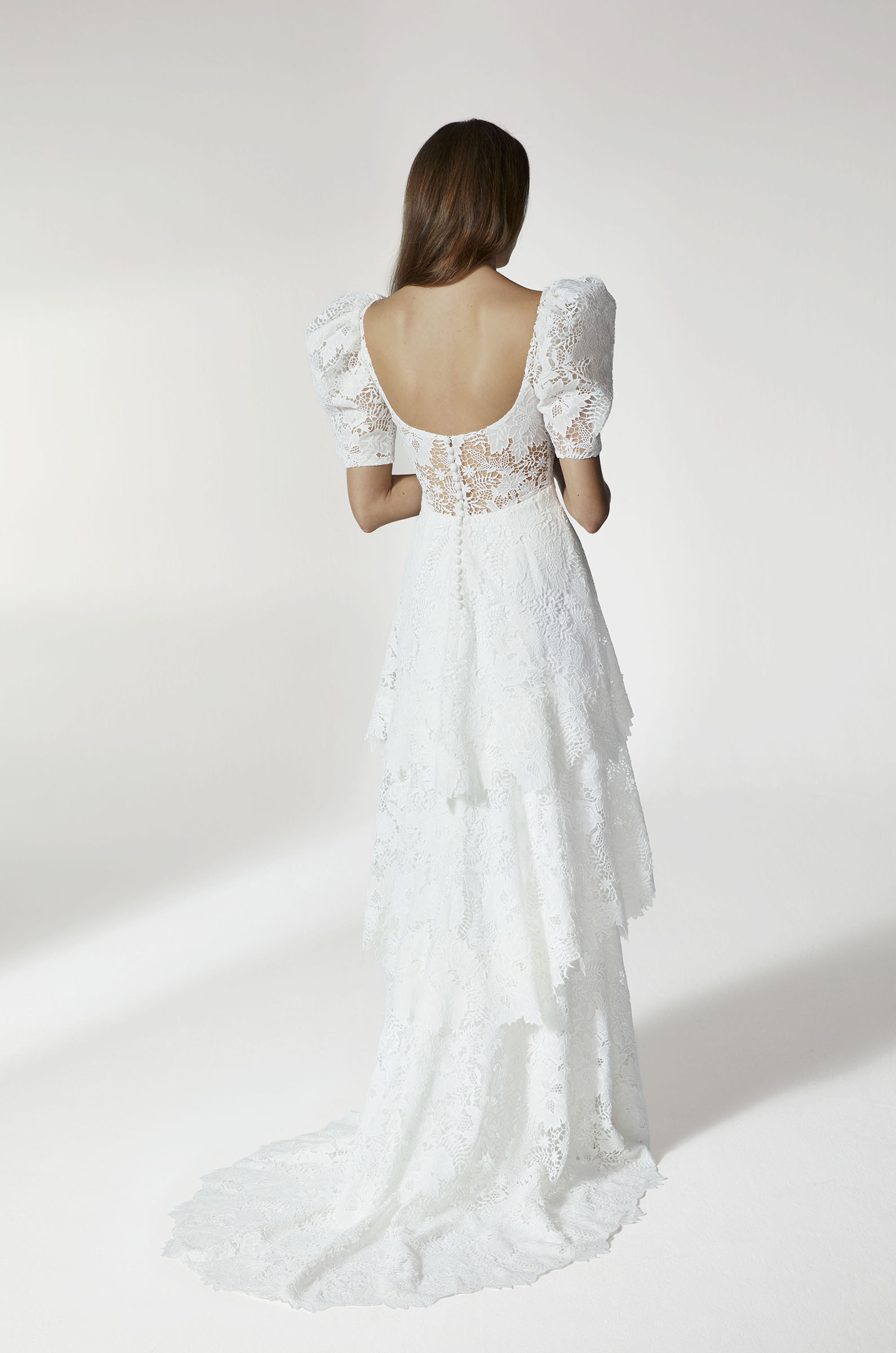 Vestido de noiva a três folhos, manga “gigot” e jogo de decotes quadrados, em guipur bordado com “cut-out” em transparência.